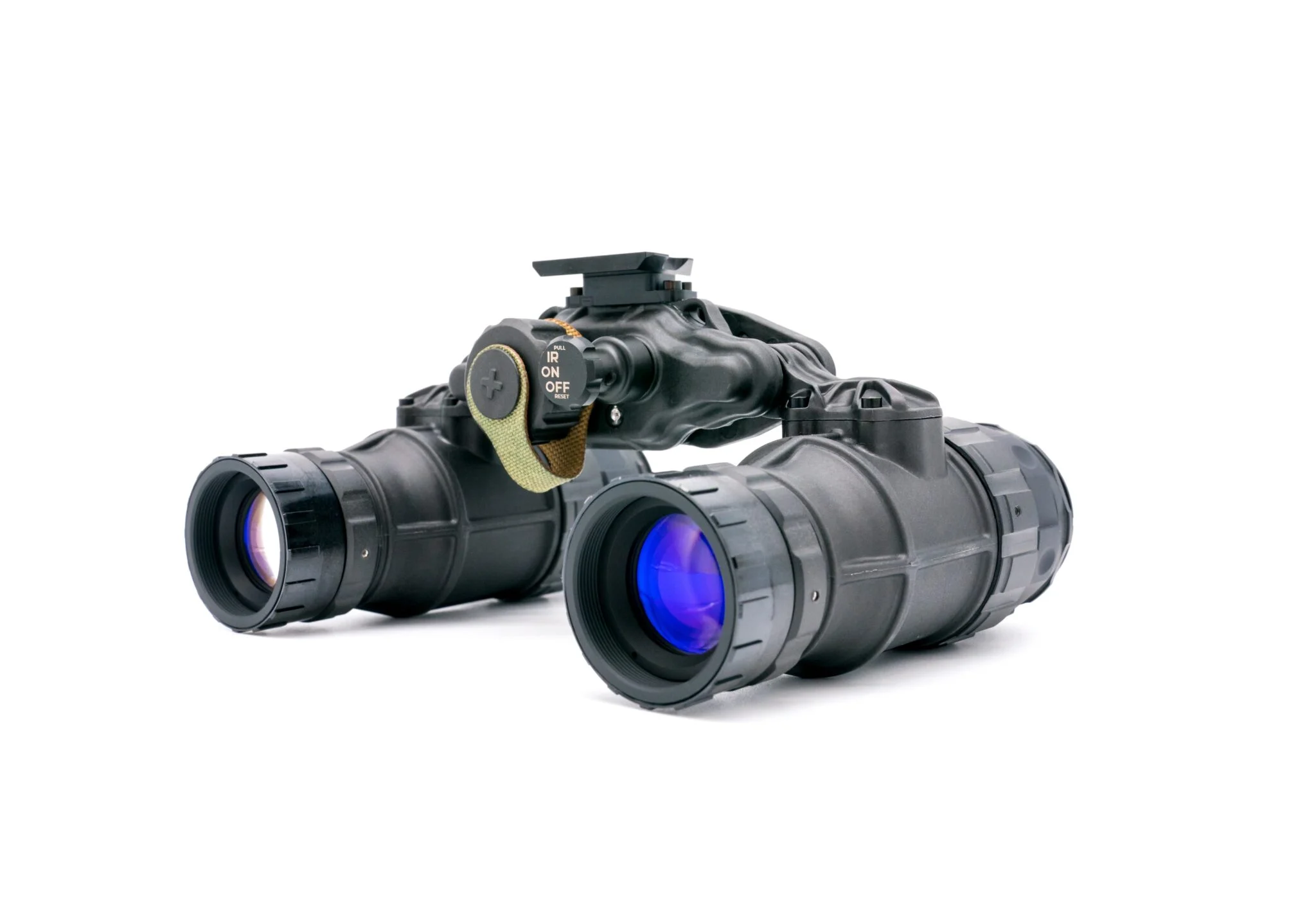 In addition to a very rugged design, the DTNVS features independent pod shutoff when articulated. This means that when the pods are articulated out away from the eye they shut off eliminating any visible glow and preventing accidental light damage when articulated. This is a particularly helpful feature for users that are using handheld thermal scanners or using a weapon mounted clip-on or thermal device. This also gives the user the option to run only one pod and keep one eye unaided.