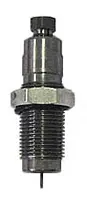Die sets for straight wall cases contain three dies. This is necessary because it is not possible to full length resize straight wall cases and expand the neck for proper bullet fit in one operation. The full length (FL) resizing die contains a decapping rod assembly. The expander die (EXP) contains a neck expanding plug. The seating die (ST) includes bullet guide built-in crimp ring and the proper seating plug.