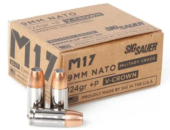 The high-performance M17 9mm +P ammunition is military-grade ammunition available in 124gr SIG Elite M17 V-Crown Jacketed Hollow Point (JHP) personal defense loads and SIG Elite M17 Full Metal Jacket (FMJ) training loads. SIG M17 ammunition is specifically engineered for exceptional performance in any 9mm +P rated pistol including the SIG P320 M17. SIG M17 FMJ training ammunition is engineered to match SIG M17 V-Crown ballistics for a more seamless transition from training to carry ammunition and features durable copper jacketed bullets offering the perfect combination of affordability and performance.
